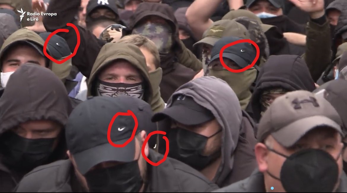 Gjithashtu në këtë protestë janë shfaqur njerëz me kapele të zeza dhe me fytyrë të mbuluar që mbanin simbolin e grupit famëkeq të lidhur me Vuçiç. Të gjithë pjesëtarët e këtij grupi kishin veshur kapele identike që mban dhe famëkeqi Veljko Belivuk.