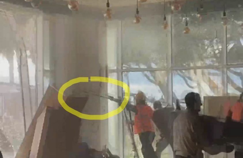 Në pamje shihen rruspat e IKMT-së që kanë shembur pjesën e restorantit të “Prestige Resort”, ndërkohë që nuk i është dhënë mundësia avokatëve të “Hysenbelliu Group” që të ankimojnë këtë aksion në Gjykatën Administrative.