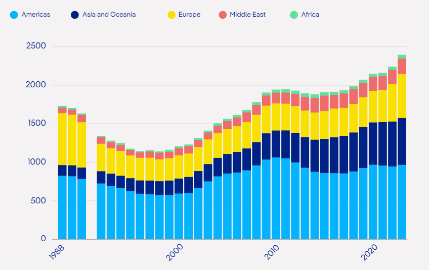 Shpenzimet ushtarake janë rritur në Afrikë, Lindjen e Mesme, Evropë, Azi, Oqeani, Amerikën Veriore dhe atë Jugore. Është hera e parë që nga viti 2009 që shpenzimet vjetore janë rritur në të njëjtën kohë, në të gjitha rajonet gjeografike të vëzhguara nga SIPRI.