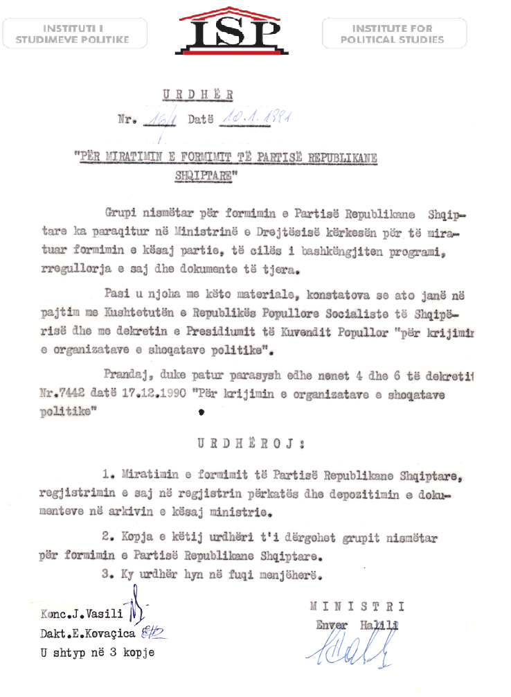 PR feston të hënën 30 vjetorin e themelimit. Instituti i Studimeve Politike ka publikuar vendimin e miratimit te saj më 1991.