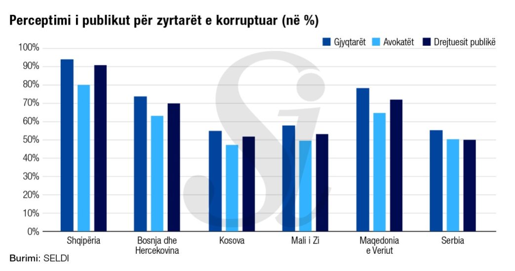 Gjithashtu, në Shqipëri është perceptimi më i lartë publik se gjykatësit, juristët dhe prokurorët publikë janë të korruptuar.