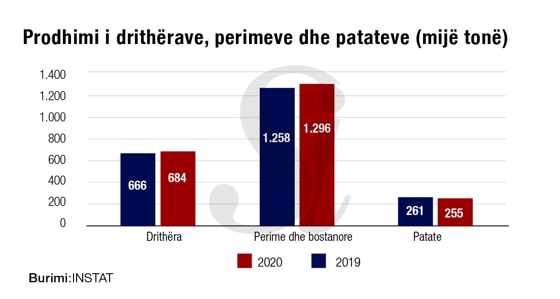 Në vitin 2020, prodhimi i perimeve është 1.295.726 tonë, duke shënuar rritje vjetore me 2,99 %, krahasuar me vitin 2019. Niveli më i lartë i prodhimit të perimeve është në qarqet Fier me 506.531 tonë, Berat me 131.735 tonë dhe Tiranë me 130.001 tonë.