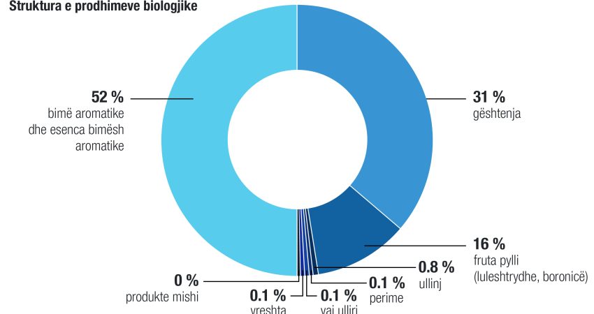 Sipas Ministrisë së Bujqësië, pjesën më të madhe të prodhimit biologjik/bio/organik në vend e zë prodhimi (mbledhja dhe kultivimi) i bimëve aromatike mbi 50%, geshtenja 30%, frutapylli 16% dhe frutaperime, vaj ulliri, ullinj në sasi të pakonsiderueshme.