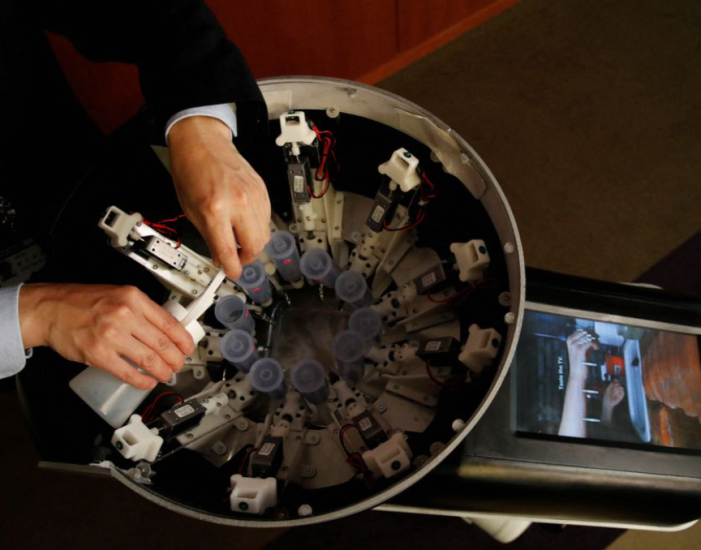 Studentja e Meiji, Yuki Hou, 22 vjeçe, demonstroi TTTV për gazetarët, duke i thënë ekranit se donte të shijonte çokollatën e zezë. Pas disa përpjekjesh, një zë i automatizuar përsëriti porosinë dhe karuseli hodhi një mostër në një fletë plastike.
