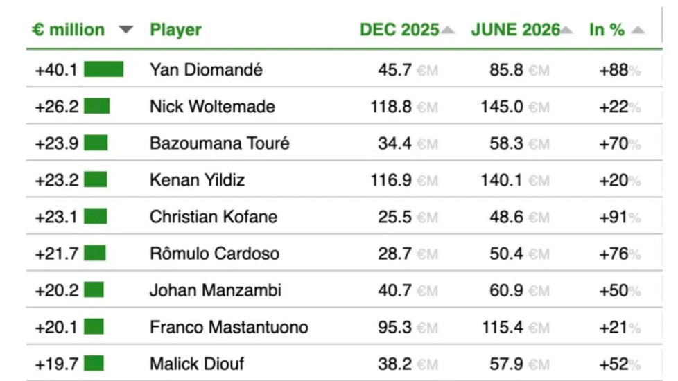 Ylli i Newcastle United, Nick Woltemade, renditet i dyti në listë. Raporti i ri vlerëson se çmimi i tij aktual është 118.8 milionë € (rreth 103.8 milionë £) dhe parashikohet të rritet në 145.0 milionë € (rreth 126.7 milionë £) deri në Qershor 2026 — një rritje prej 26.2 milionë € (rreth 22.9 milionë £).