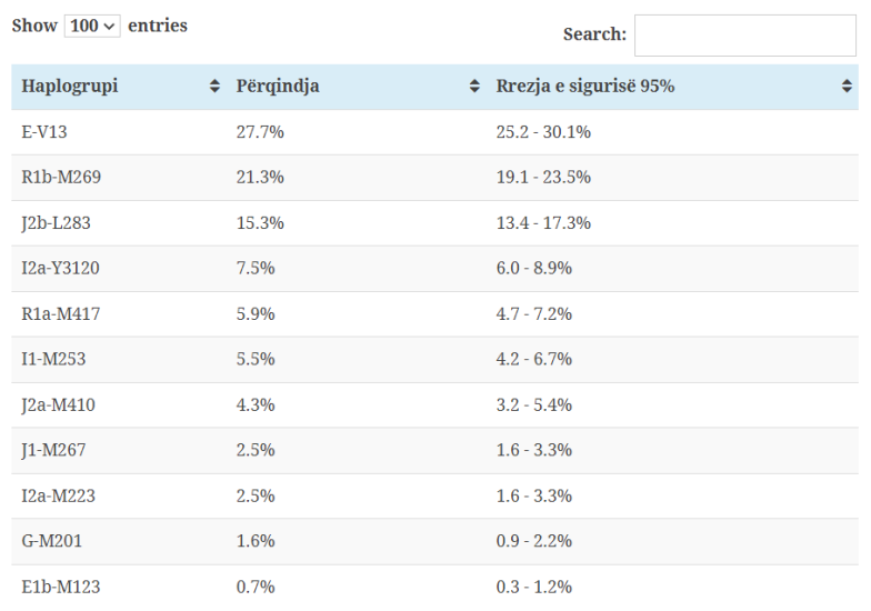 Nga drejtpeshimi statistikor i 1322 rezultateve, del se rreth 10 haplogrupet më të shpeshta përmbledhin rreth 94.6% të gjithë linjave atërore shqiptare.