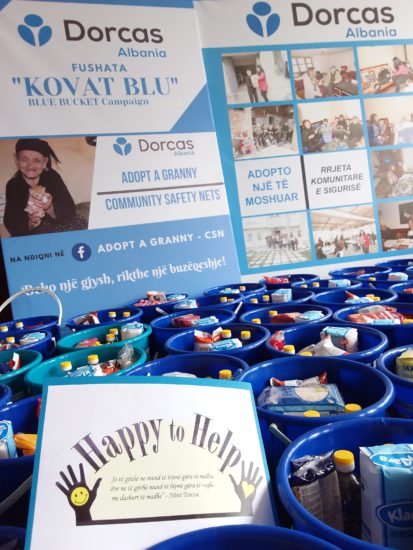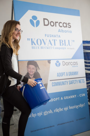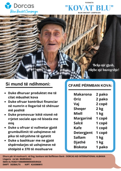 “Ne mendojme të sigurojmë ushqime mjaftueshëm për 4 muaj për 355 të moshuarit pjesë e projektit, por dëshirojme të ndihmojmë edhe 30 të tjerë jashtë projektit. Është e rëndësishme të përmendet se “Dorcas Albania” është një nga organizatat e pakta që mbështesin këtë kategori, jo vetëm në nivel vendor, por edhe në nivel kombëtar. Bluja është ngjyra zyrtare identifikuese e organizatës dhe kova, në vend të kutisë, me qëllim për t’i dhuruar familjes diçka që u duhet në shtëpi”, shton Bogdani.