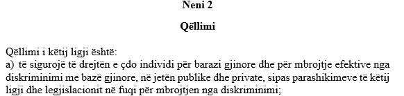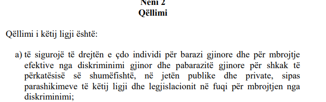 Në projekt draftin e vjetër përmendet se qëllimi i këtij ligji është që të sigurojë të drejtën e çdo individi për barazi gjinore dhe për mbrojtje efektive nga diskriminimi me bazë gjinore.