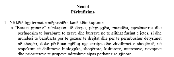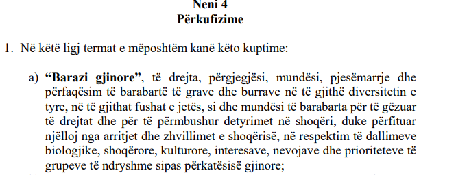 “’Barazi gjinore’ nënkupton të drejta, përgjegjësi, mundësi, pjesëmarrje dhe përfaqësim të barabartë të grave dhe burrave në të gjithat fushat e jetës, si dhe mundësi të barabarta për të gëzuar të drejtat dhe për të përmbushur detyrimet në shoqëri…”, thuhej në projektligjin e vjetër.