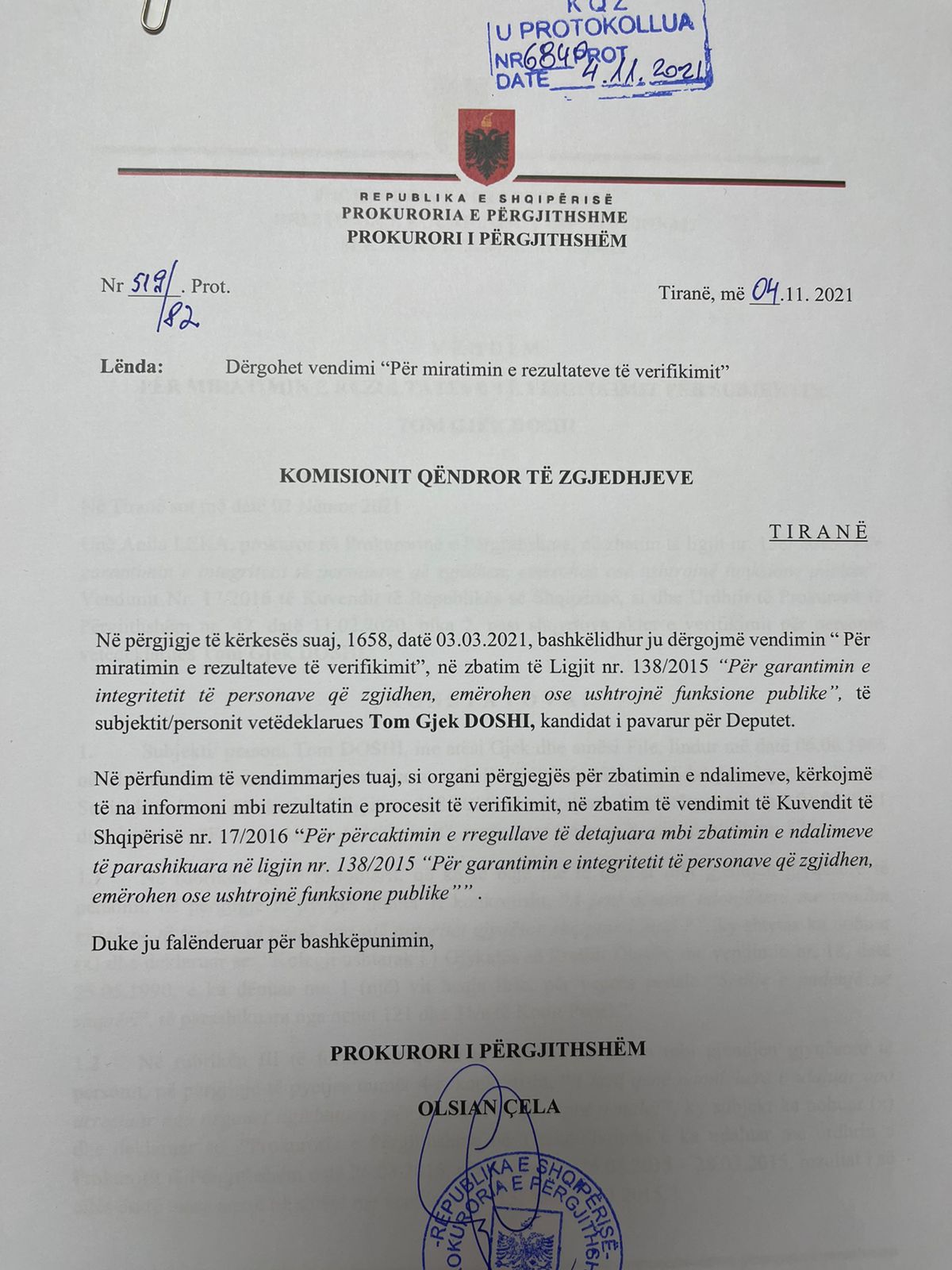 Në shkresë përgjigjjen që KQZ-ja ia vendosi në dispozicion në rrugë jozyrtare Gazetës “Si”, theksohet se dekriminalizimi ka kërkuar edhe 16 vjet përpara se Tom Doshi të kishte lindur dhe konkretisht në vitin 1950, atëherë kur ka zbuluar një “ë” më shumë në emrin e babait të tij, një “ë” që më pas iu shtua pa dashje gjatë vitit 1974 edhe Tom Doshit. Konkretisht në gjetjet e prokurorisë thuhet se “rezulton se në regjistrin themeltar të regjistrimit të popullsisë të vitit 1950 dhe të vitit 1974 të ketë emrin Tomë dhe emrin e babait Gjekë, të regjistruar gabimisht në Tom dhe Gjek në Regjistrin Kombëtar të Gjendjes Civile viti 2010.