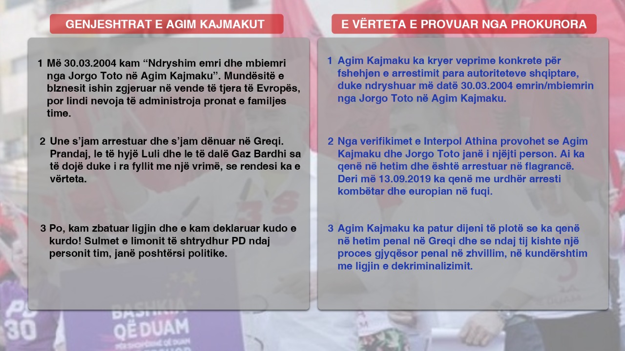 Prokuroria e Përgjithshme nis hetimet ndaj kryetarit të Bashkisë së Vorës, Agim Kajmaku, pas konstatimit nga hetimi se ka gënjyer në formularin e Dekriminalizimit, duke mos deklaruar se ka qenë i arrestuar dhe më pas nën hetim nga drejtësia greke. Nga përgjigjja që Interpol Greqia dhe Interpol Tirana i kanë dërguar Prokurorisë së Përgjithshme, është vërtetuar se gjurmët e gishtërinjve të Agim Kajmakut janë të njëjta me Jorgo Toton, i cili është arrestuar në Greqi dhe këtë arrestim nuk e ka deklaruar kur ai kandidoi për zgjedhjet e 30 qershorit si kandidat i Partisë Socialiste. Sipas ligjit, zyrtarët të cilët gënjejnë në formularin e dekriminalizimit, rrezikojnë të dënohen deri në 4 vite heqje lirie. Sipas burimeve, mësohet se “Kajmaku ka pasur detyrimin te deklaroje se është arrestuar ne flagrance dhe nuk e ka kryer atë” dhe se kryebashkiaku i Vorës ka nxjerrë edhe si dokument pafajësinë e marrë me vendimin e shtatorit të vitit 2019. Kjo është edhe prova që vetë Kajmaku e ka paraqitur zyrtarisht në letrën e depozituar në Prokurori ku deklaron se nuk ishte në dijeni që ishte në hetim”.