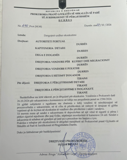 Prokuroria pranë Gjykatës së Shkallës së parë të Juridiksionit të Përgjithshëm Durrës, ka regjistruar procedimin penal dhe në funksion të këtij procedimi, në vendim shkruhet se shihet e nevojshme që të sekuestrohen 102 kontenierët në cilësinë e provës materiale, të cilët janë duke transportuar në Shqipëri me anijen MOLIVA XA443A, me qëllim kryerjen e ekspertimeve përkatëse.