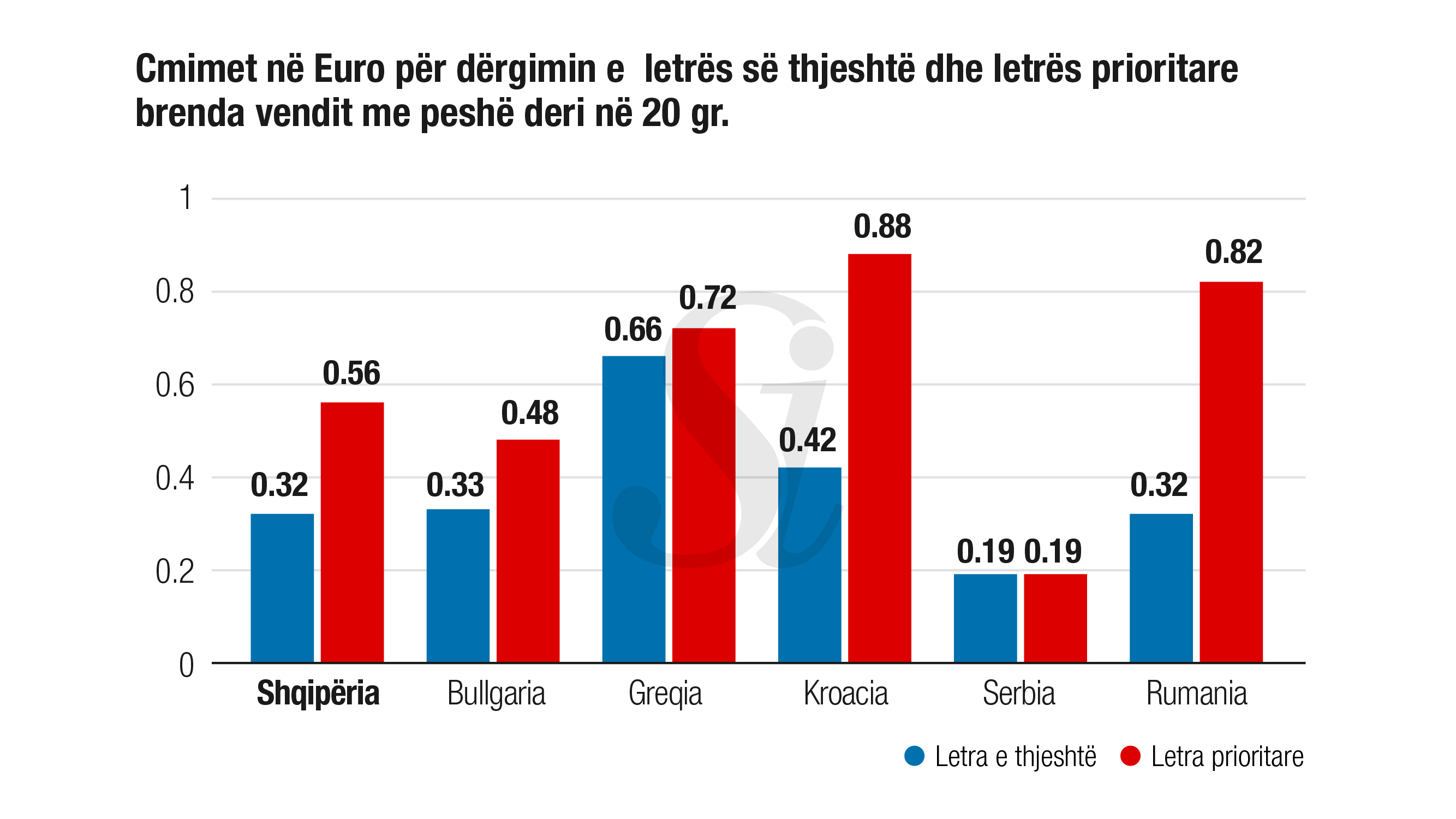 Referuar tarifave të aplikuara në Shqipëri nga ofruesi i shërbimit universal në strategjinë e Ministrisë të Energjetikës, tarifat për dërgimin e letrës me peshë 20 gram brenda vendit janë përkatësisht 70 lekë për letrën e porositur dhe 40 lekë për letrën e thjeshtë. Çmimi mesatar në Europë për dërgimin e një letre prioritare me peshë deri 20 gr brenda vendit është 0,91 euro. Ky çmim ka pasur një rritje me 9, 3% gjatë periudhës 2014-2018. Çmimi mesatar në Europë për dërgimin e një letre të thjeshtë me peshë deri 20 gram brenda vendit është 0.64 euro dhe ka pasur një rritje mesatare prej 1, 8% në vitin 2018 kundrejt vitit 2017.