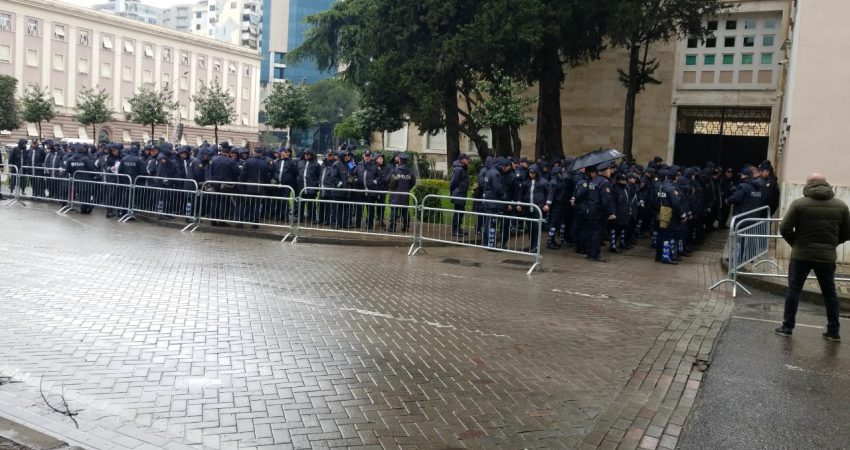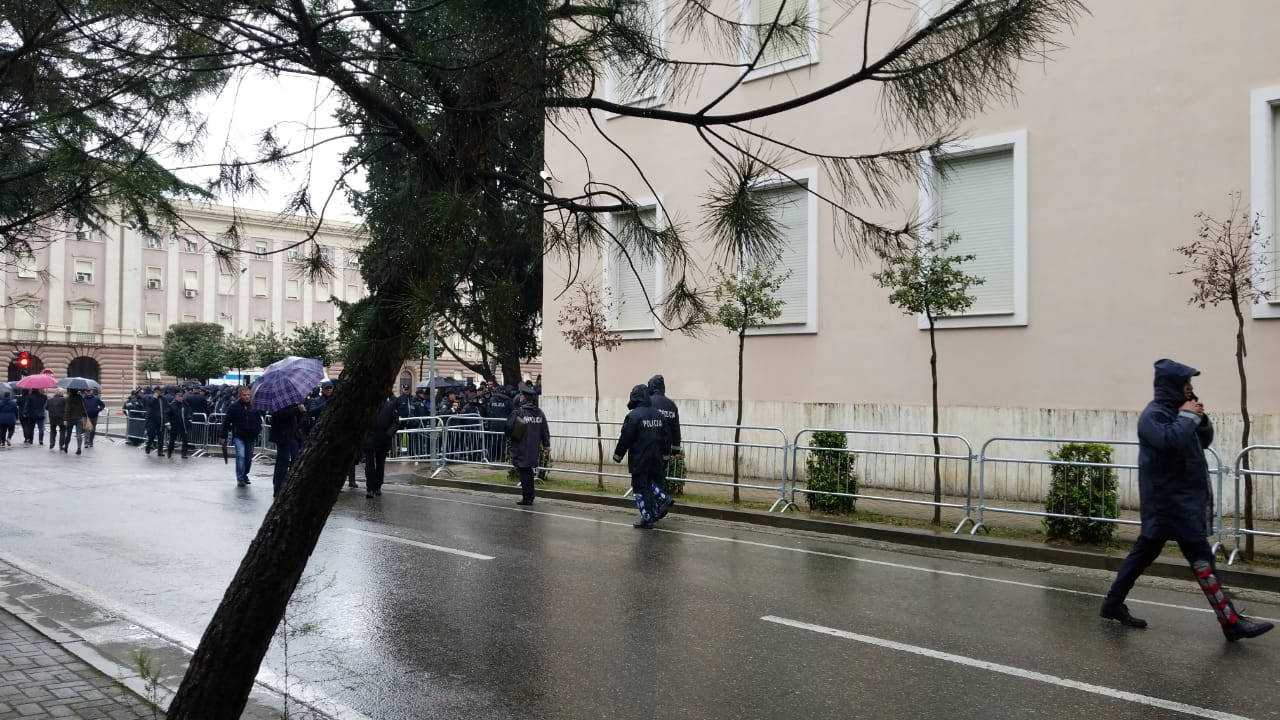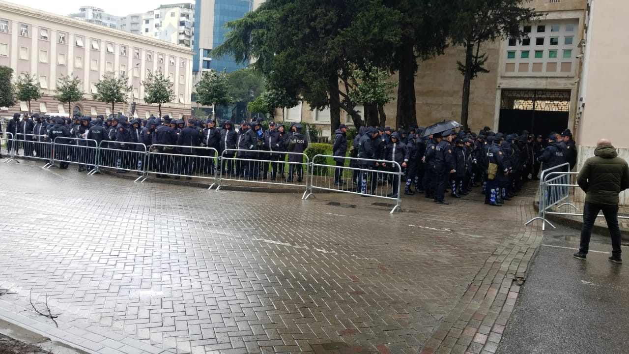 Që mbrëmë policia rrethoi me gardhe hekuri perimetrin përreth godinës së Kryeministrisë, si dhe pjesën anësore në krah të godinës së Piramidës. Kamerat e sigurisë janë pastruar sot paradite, si dhe derës kryesore të godinës qeveritare i janë vënë sërish pjesët mbrojtëse hermetike. Gjithashtu parashikohet që blindat e hedhjes së ujit të jenë pranë selisë së qeverisë për të qenë në gatishmëri për të ndërhyrë në rast se protesta do të përshkallëzohet. Ashtu si dhe në protestat e tjera, policia ka lyer shtyllat e ndriçimit me graso, për të mos lejuar ngjitjen e protestuesve, si dhe ka vendosur autoparlantët për t’i përdorur në rast konstatimit të ndonjë incidenti apo tentative për të ushtruar dhunë.