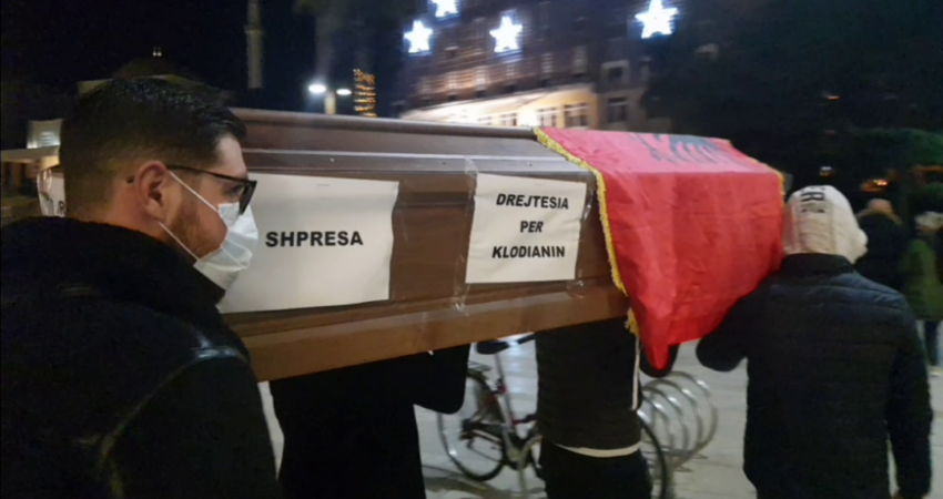 Disa të rinj kishin dalë për të protestuar për të disatën ditë për vrasjen e Klodian Rashës, teksa kishin gjetur një mënyrë tjetër me arkivol, flamur shqiptar mbi të dhe me parrullën ”Drejtësia ka vdekur”.