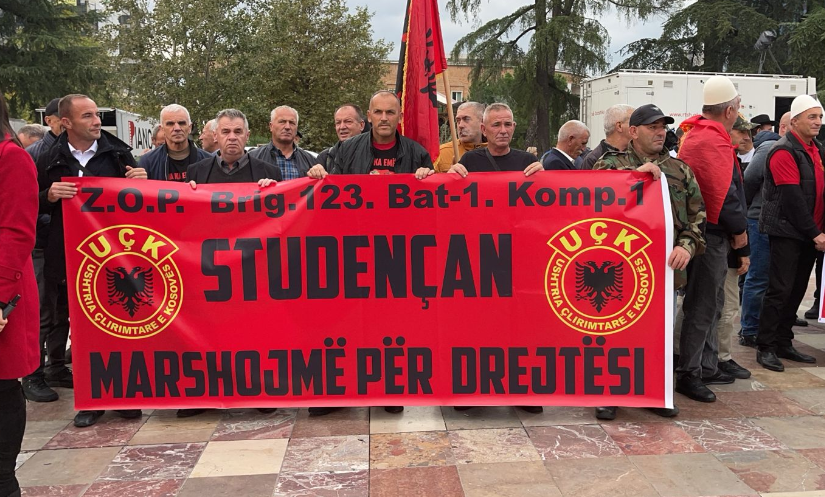 Protesta, e organizuar me moton “Liria ka emër” nga veteranët e UÇK-së, nisi me himnin kombëtar dhe vijoi me fjalën e ish-komandantit të UÇK-së, Hysni Gucati.
