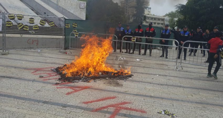 Protestuesit kanë mbërritur te Piramida, ku kanë vendosur një instalacion para saj dhe më pas i kanë vënë flakën. Bëhet fjalë për një objekt në formën e piramidës që simbolizon për ta piramidën e krimit.