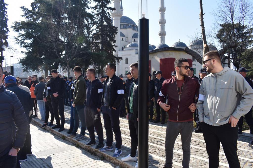 Më pas, të rinjtë, që mbanin në krah një rrip dallues u vendosën mes protestuesve dhe forcave të policisë me detyrën për të shmangur dhunën. Që dhuna do të shmangej u zotuan edhe drejtuesit e Partisë Demokratike para se protestuesve para Parlamentit t’i bashkohej Lulzim Basha.