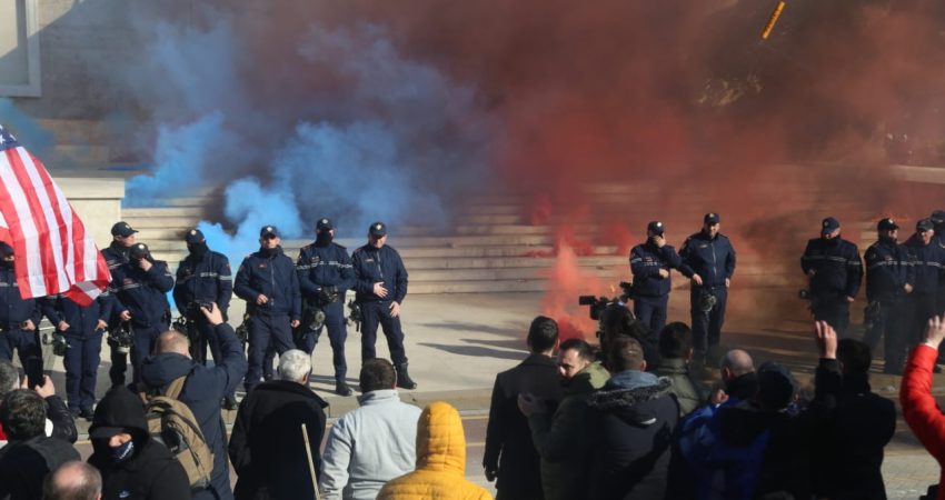 Protestuesit kanë hedhur flakadanë dhe tymues drejt Kryeministrisë dhe forcave policore qw qwndronin aty. Ndërkohë ata vazhdojnë marshimin në kryeqytet.