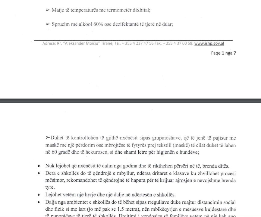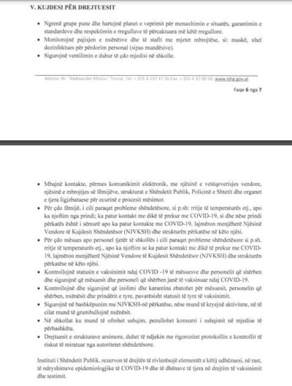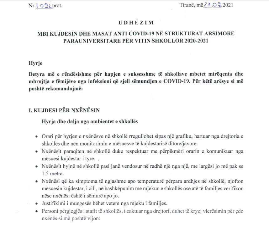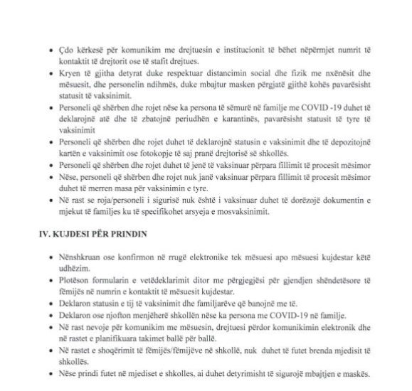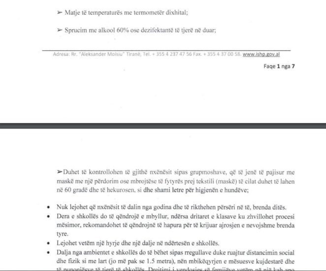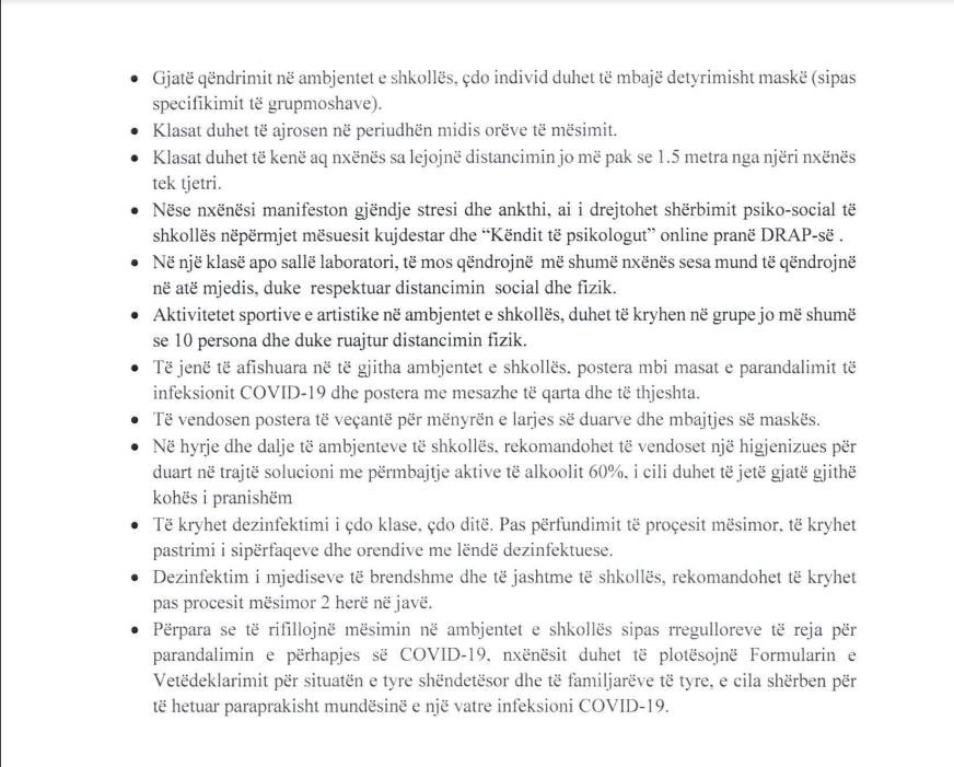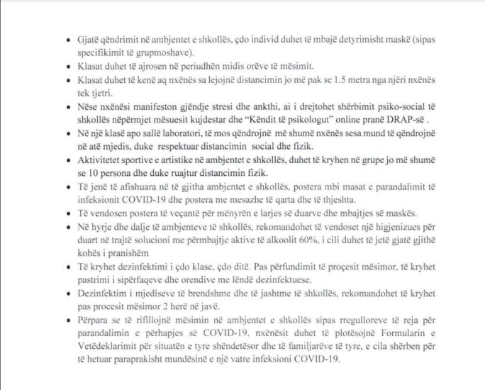 Sipas udhëzimit nxënësi që kanë simptoma të ngjashme me Covid-19 duhet të njoftojë mësuesin kujdestar dhe justifikimi i mungesës në shkollë bëhet vetëm nga mjeku i familjes.