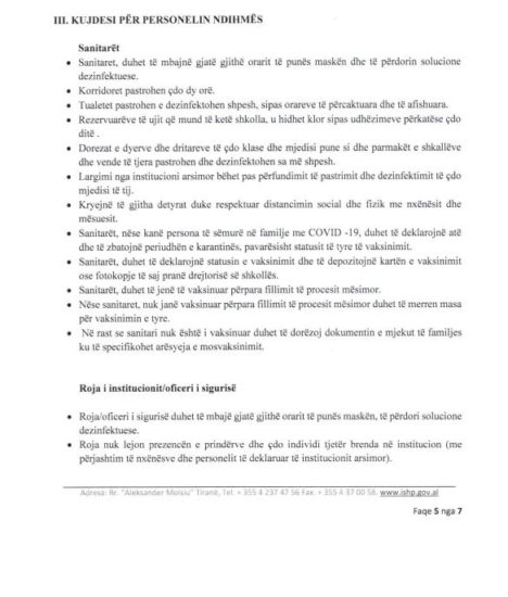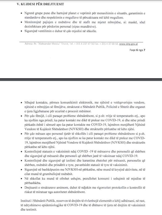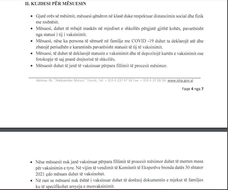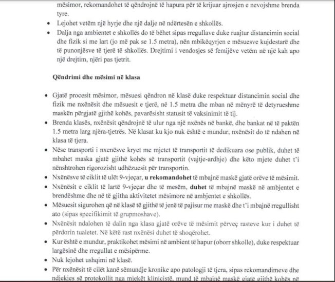 Në këtë udhëzim përcaktohet se gjatë procesit mësimor, mësuesi duhet të qëndrojë në klasë duke respektuar distancimin social dhe fizik me nxënësit dhe pavarësisht statusit si i vaksinuar duhet të mbajë gjatë gjithë kohës maskën.