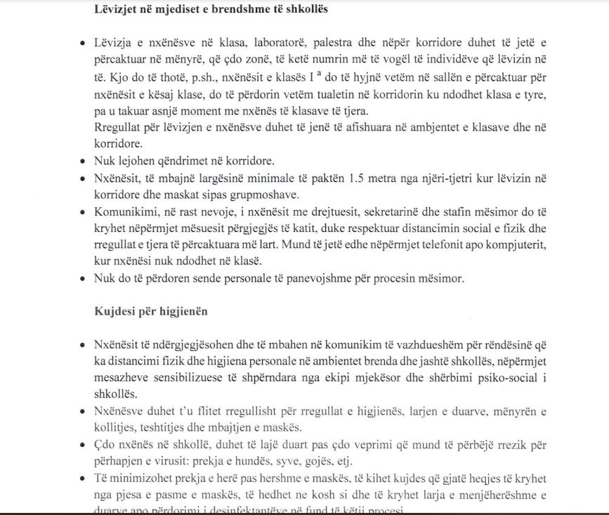 Në udhëzim përcaktohet se hyrja e nxënësve në shkollë duhet të jetë në radhë një nga një, me largësi jo më pak se 1.5 metra.