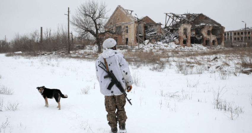 Një ushtarak ukrainas ecën në fshatin Peski të rajonit Donetsk, Ukrainë, afër vijës së frontit me separatistët e mbështetur nga Rusia, më 25 janar. ANATOLII STEPANOV/AFP VIA GETTY IMAGES