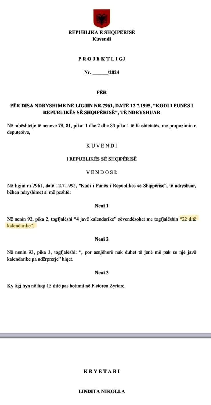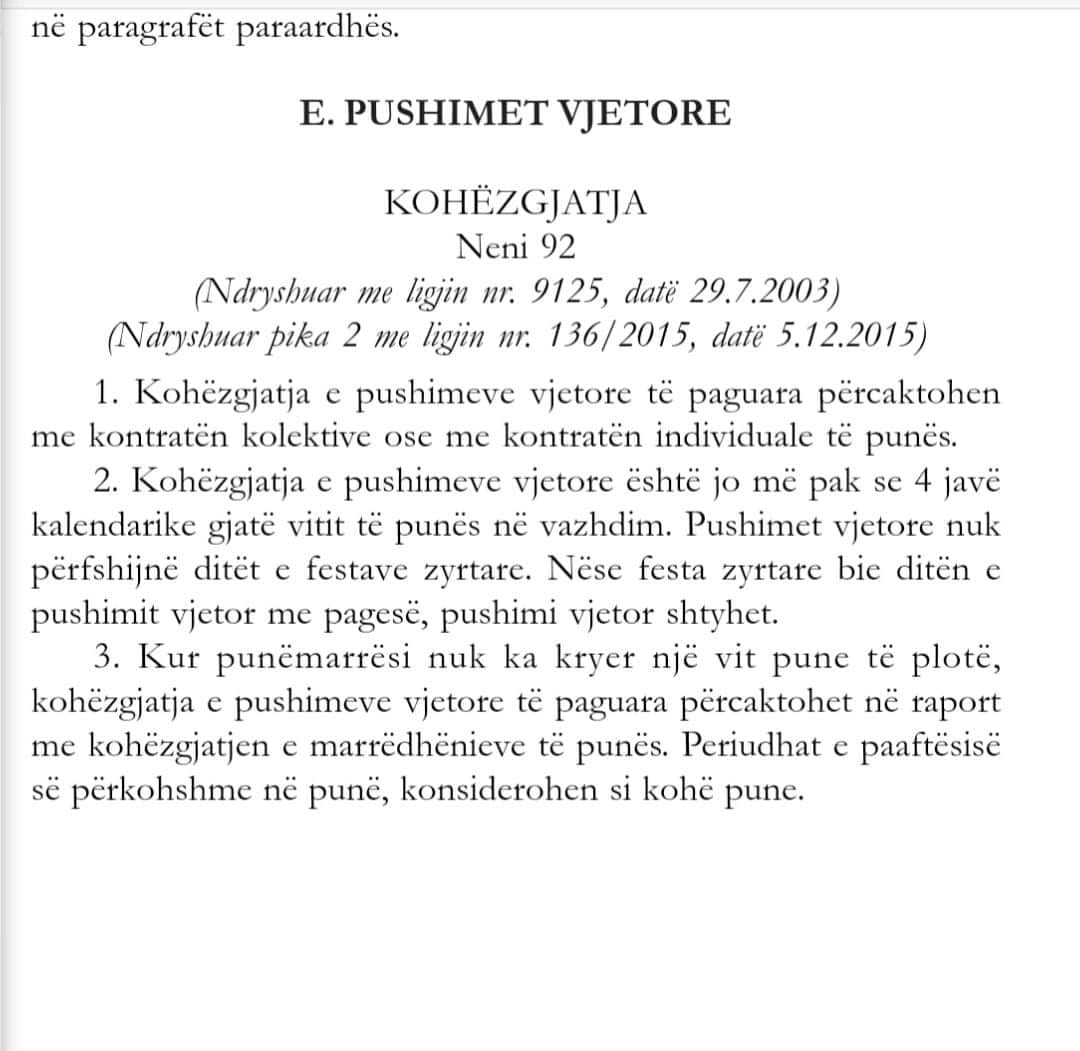 Sipas këtij propozimi, i cili ka të bëjë me kohën e pushimeve vjetore të pagueshme, është hequr nga Kodi i Punës, Neni 92 pika 2, togfjalëshi “4 javë kalendarike” dhe është ndryshuar me togfjalëshin “22 ditë kalendarike”.