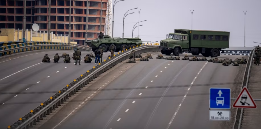 Ushtarët ukrainas në pozicione në një urë brenda qytetit të Kievit më 25 shkurt 2022. Pas nisjes së sulmeve ajrore në qytete, instalimeve ushtarake dhe zbarkimit të trupave dhe tankeve nga tri drejtime, pushtuesit rusë arritën përfundimisht në periferi të kryeqytetit.