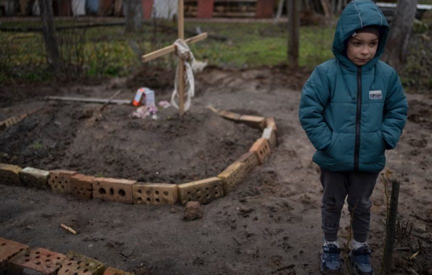 Vlad Tanyuk, 6 vjeç, duke qëndruar pranë varrit të nënës së tij, Ira Tanyuk, në oborrin e shtëpisë në periferi të Kievit më 4 prill 2022. Vdekja e nënës së tij erdhi si pasojë e urisë dhe stresit nga pushtimi rus.