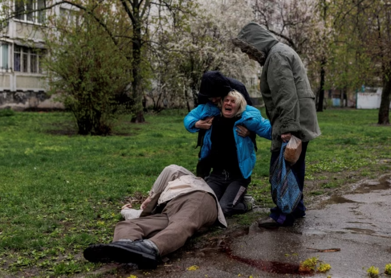 Yana Bachek ngushëllohet nga partneri i saj, Yevhen Vlasenko, dhe nëna e saj, Lyubov Hubareva, teksa qan mbi trupin e babait të saj, Viktor Hubarev, 79 vjeç, i cili u vra nga sulmet në Harkiv më 18 prill 2022.
