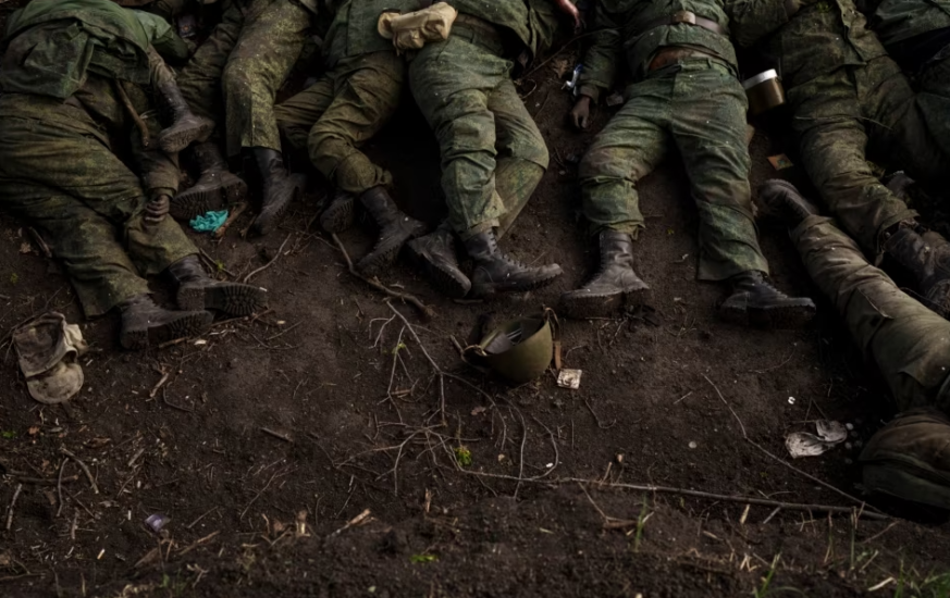 Trupat e 11 ushtarëve rusë të shtrirë në tokë në fshatin Vilkhivka, të rimarrë nga forcat ukrainase më 9 maj 2022.