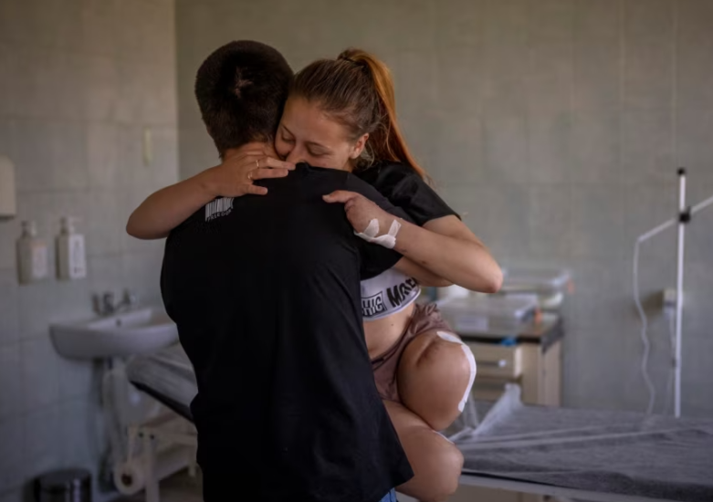 Oksana Balandina, 23 vjeç, bartet nga bashkëshorti i saj, Viktor, në një spital në Lviv më 13 maj 2022. Oksana humbi të dyja këmbët dhe katër gishtat e dorës së majtë kur një predhë shpërtheu pranë shtëpisë së saj. “Kishte një shpërthim. Ndjeva një zbrazëti në këmbët e mia menjëherë pas kësaj. Po përpiqesha të shikoja përreth dhe pashë se nuk kishte më këmbë, vetëm kocka, mish dhe gjak”, rikujton ajo. /Marrë nga REL/