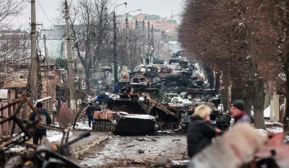 Automjetet e blinduara ruse të shkatërruara mbushin një rrugë në qytetin e Buça pranë Kievit më 1 mars 2022. Forcat ruse nuk arritën ta rrethonin apo kapnin kryeqytetin dhe përfundimisht u tërhoqën nga rajoni.