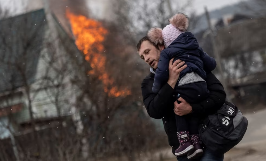 Një burrë bart një fëmijë nga qyteti Irpin pas granatimeve të rënda, ndërsa trupat ruse përparonin drejt Kievit më 6 mars 2022.