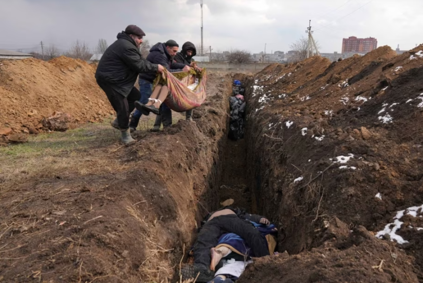Varrosja e trupave në një varr të përbashkët në periferi të Mariupolit më 9 mars 2022. Një rrethim gati tre-mujor i qytetit port rezultoi me vrasjen e dhjetëra mijëra banorëve dhe shkatërrimin e 90 për qind të ndërtesave të tij.