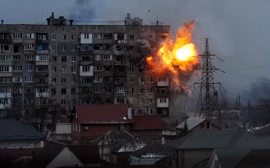 Një shpërthim në një ndërtesë apartamentesh pasi një tank rus qëlloi mbi të në Mariupol më 11 mars 2022.