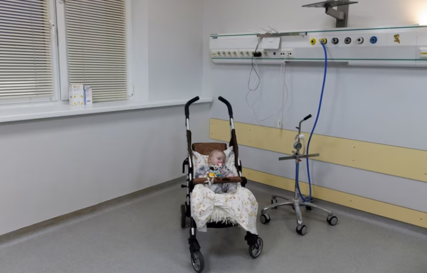 Një jetim 5-muajsh, i shpëtuar nga qyteti i rrethuar i Sumyt, duke fjetur në karrocën e tij në qendrën “Zemra e Qytetit të Kievit” (Kyiv City Heart Center), më 20 mars 2022.