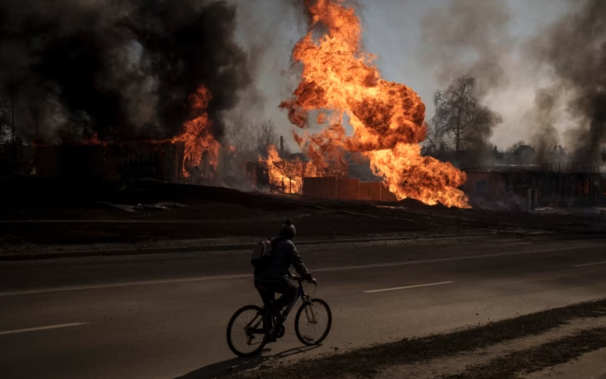 Një burrë duke kaluar me biçikletë jo larg tij shihen flakët dhe tymi që dalin nga zjarri pas një sulmi rus në Harkiv më 25 mars 2022.