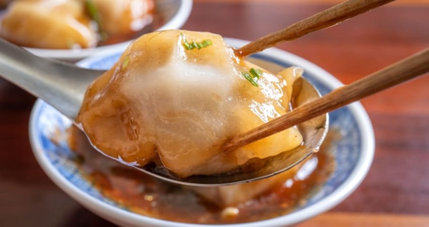 Sichuan wonton pikante, ose chao shou, vjen në tryezë i lagur me një vaj djegës pikant të aromatizuar me kokrra piper sichuan dhe një salcë uthull të zezë.