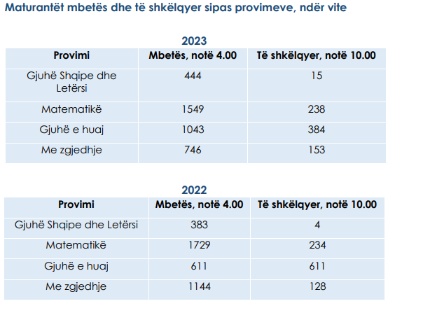Provimi më i vështirë për të fituar notën 10.00 është provimi i gjuhës shqipe dhe letërsisë, pasi vetëm 21 maturantë kanë arritur këtë rezultat në tre vitet e fundit. Në vend të dytë është provimi i matematikës me 476 maturantë. Pas tij vjen provimi me zgjedhje, ku janë 512 maturantë dhe në fund, provimi i gjuhës së huaj me 1031 maturantë të cilët kanë arritur rezultatin maksimal, notën 10.00.