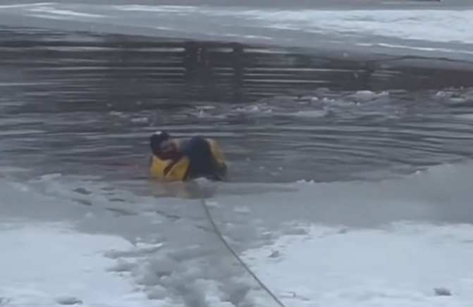 Një zjarrfikës në SHBA ka shpëtuar një qen të bllokuar në një liqen të ngrirë.