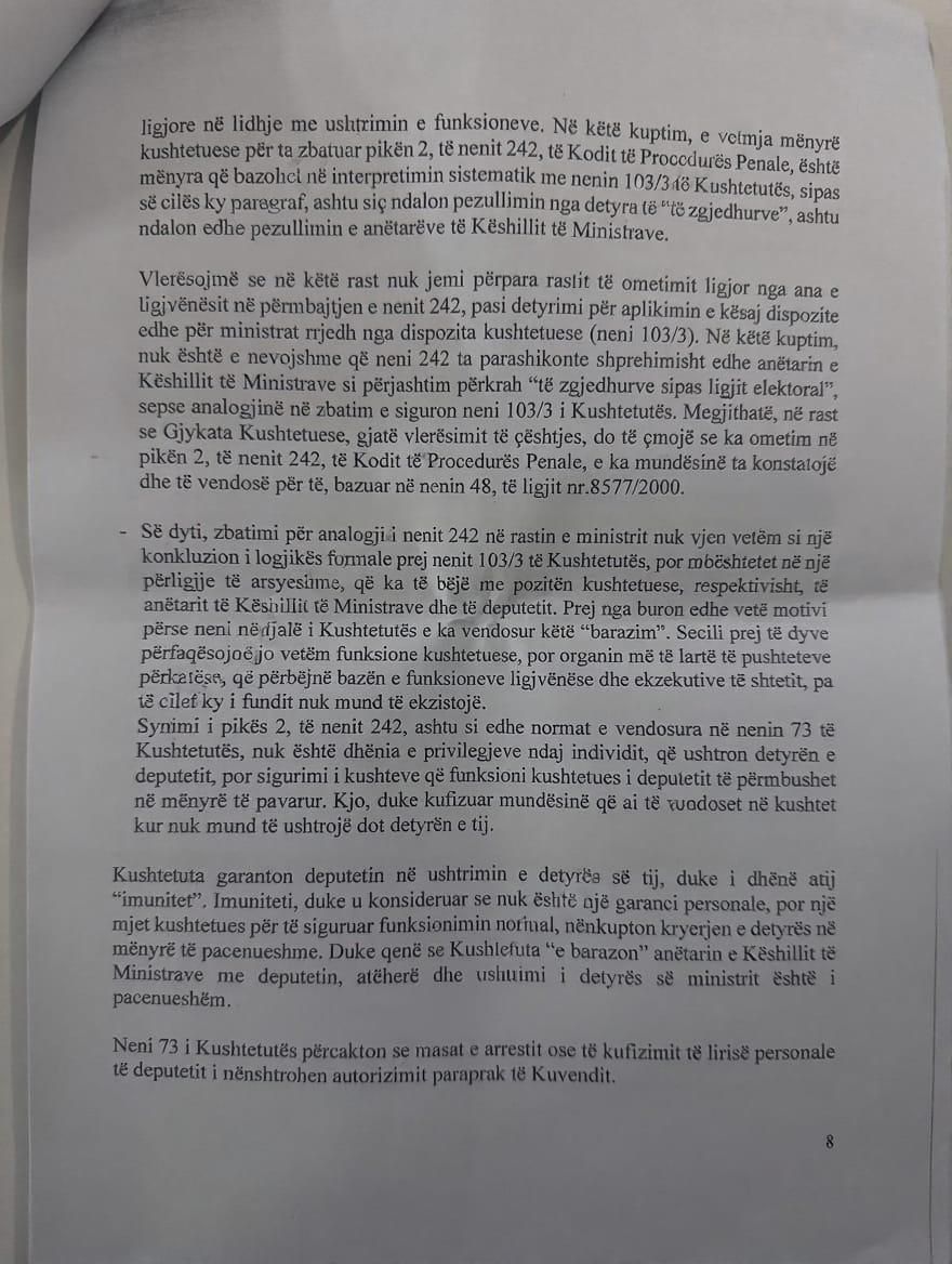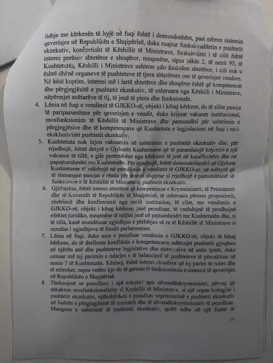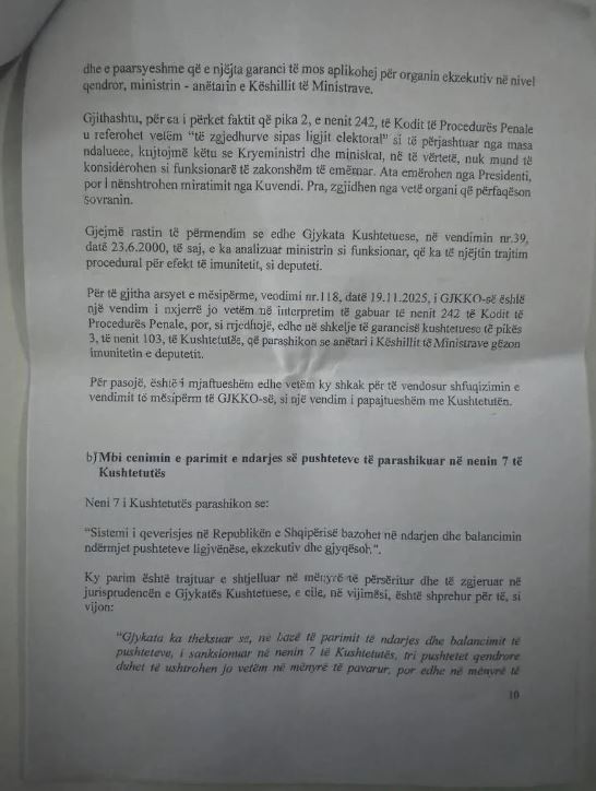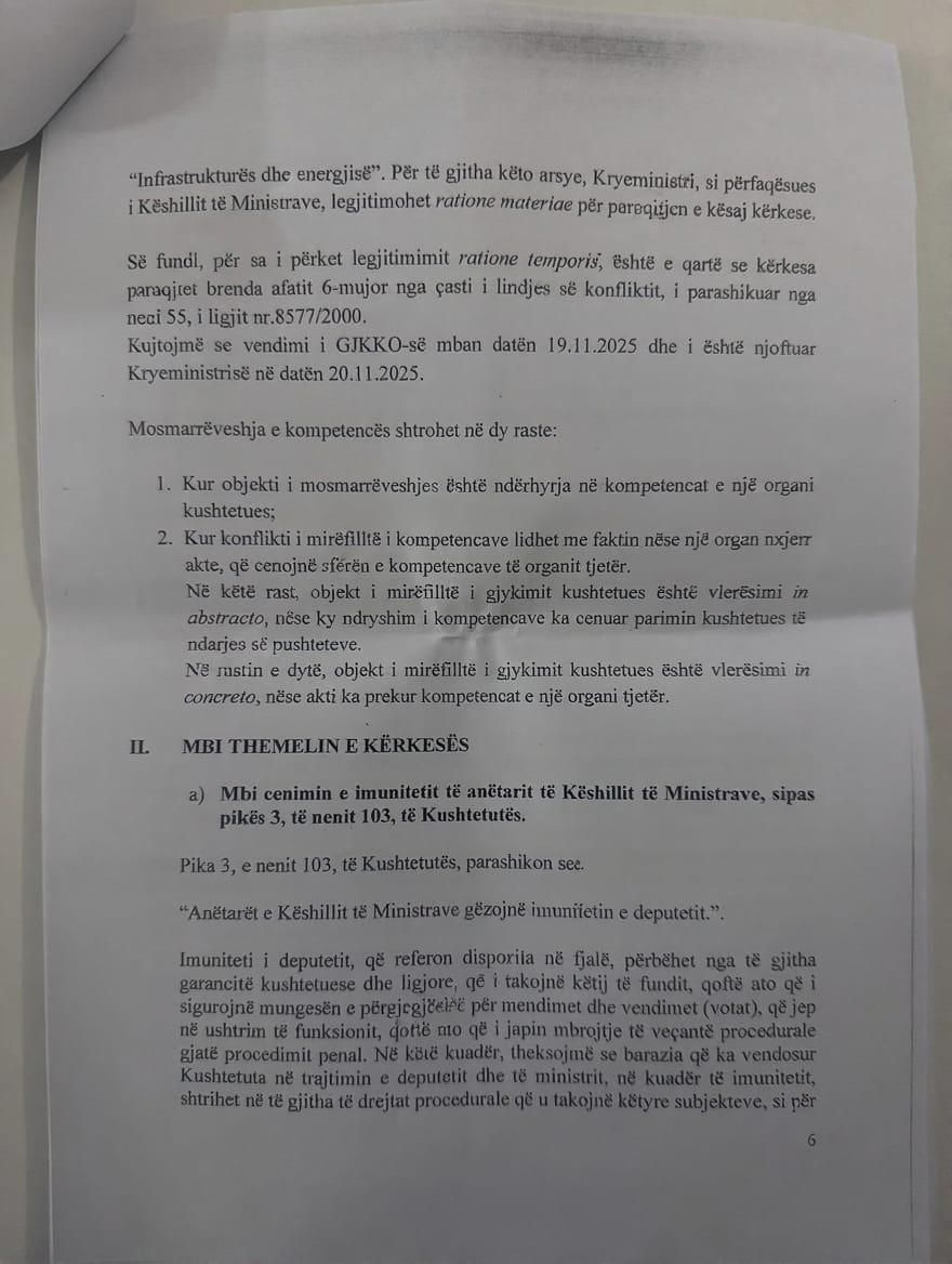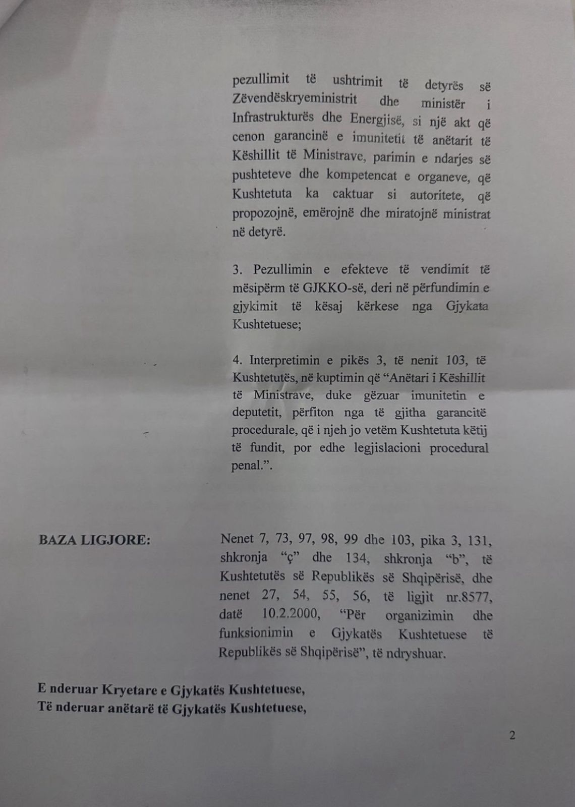 Në kërkesë, shkruhet se vendimi i GJKKO cënon garancinë e imunitetit të anëtarit të këshillit të ministrave, parimin e ndarjes së pushteteve dhe kompetencat e organeve, që Kushtetuta ka caktuar si autoritete, që propozojnë, emërojnë dhe miratojnë ministrat në detyrë.