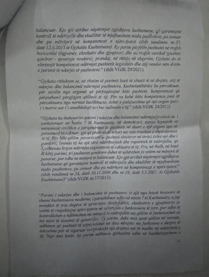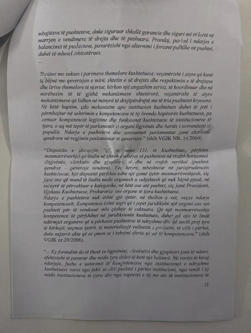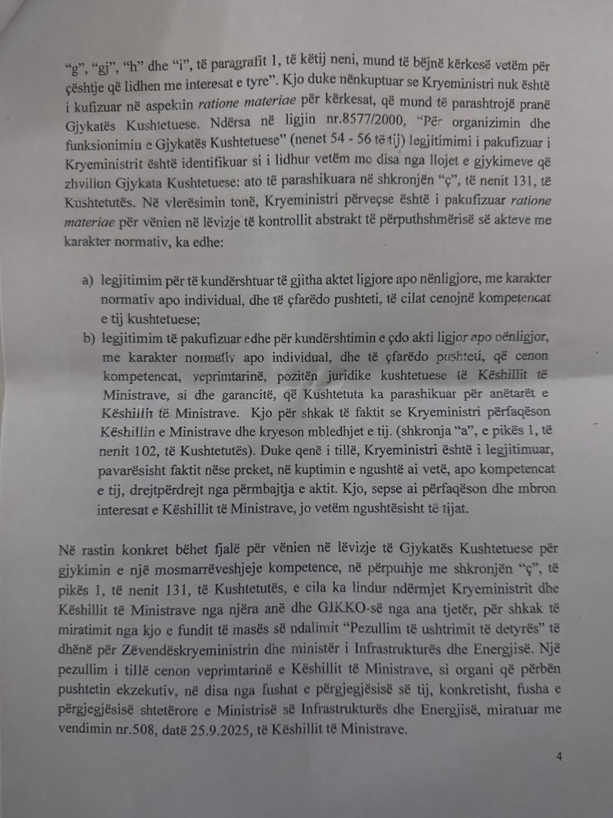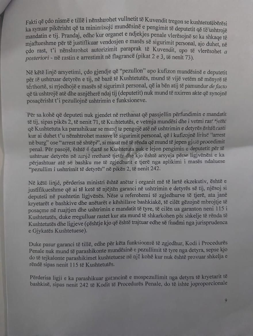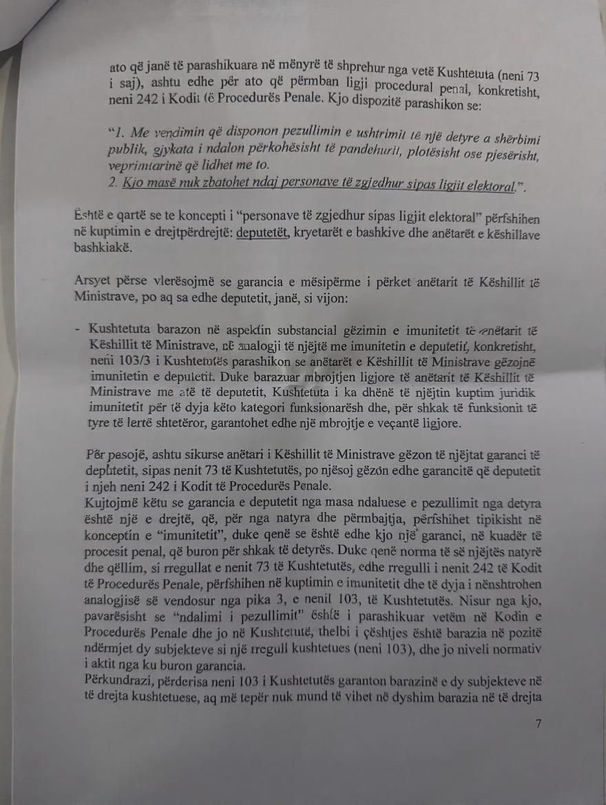 Në kërkesë, shkruhet se vendimi i GJKKO cënon garancinë e imunitetit të anëtarit të këshillit të ministrave, parimin e ndarjes së pushteteve dhe kompetencat e organeve, që Kushtetuta ka caktuar si autoritete, që propozojnë, emërojnë dhe miratojnë ministrat në detyrë.