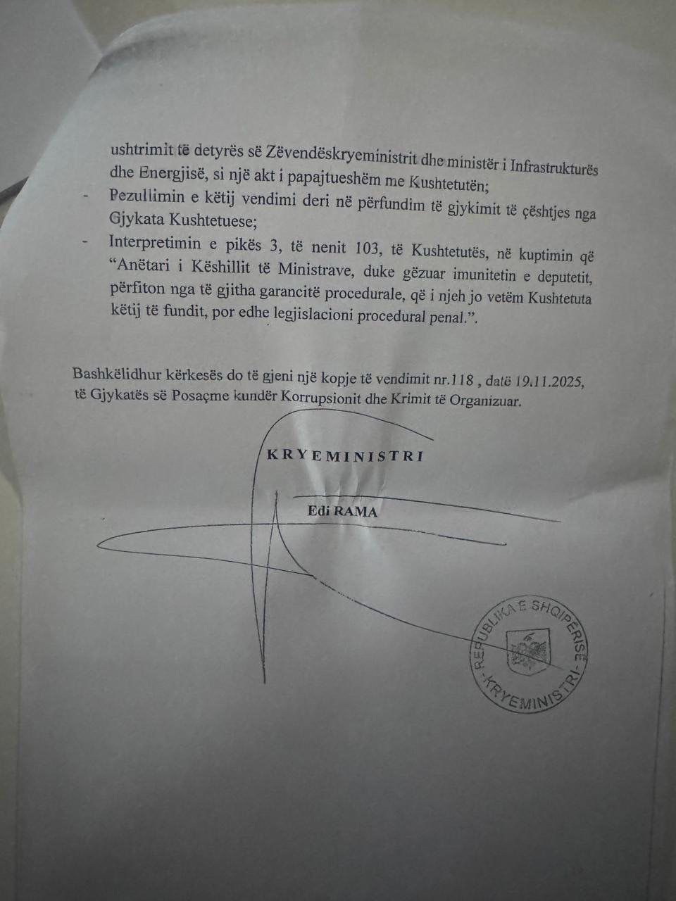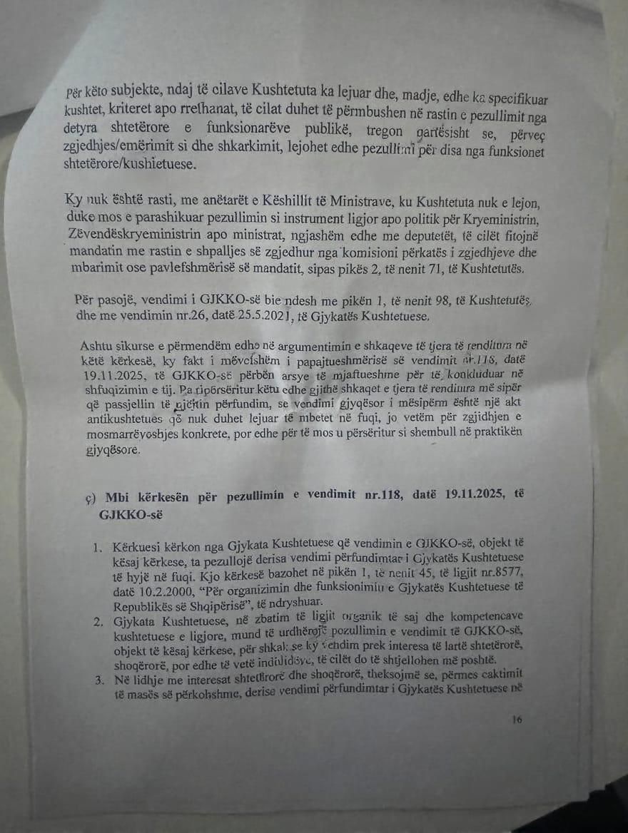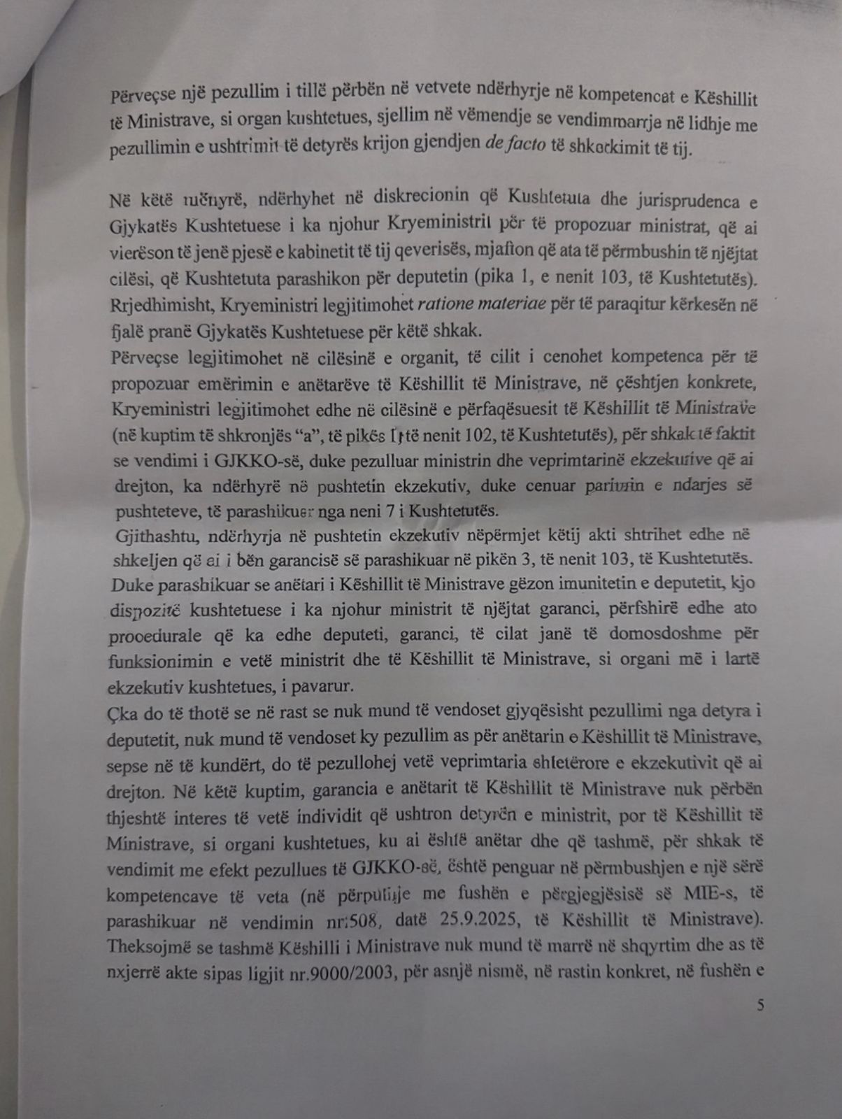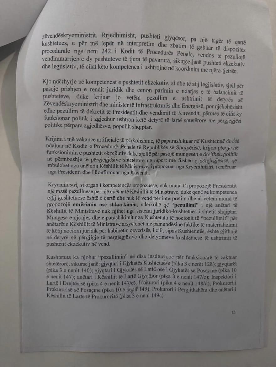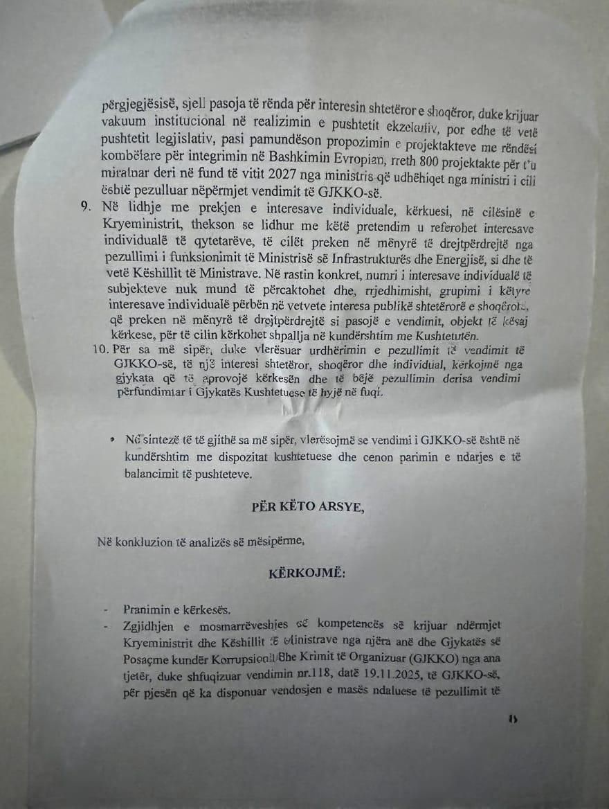 “Pezullimi sjell pasoja të rënda të interesit shtetëror e shoqëror duke krijuar vakuum institucional, pasi pamundëson propozimin e projekteve me rëndësi kombëtare për integrimin në Bashkimin Evropian, rreth 800 projekte për t’u miratuar deri në fund të 2027 nga ministria që drejtohet nga ministri i pezulluar”, argumenton Këshilli i Ministrave në dokument.