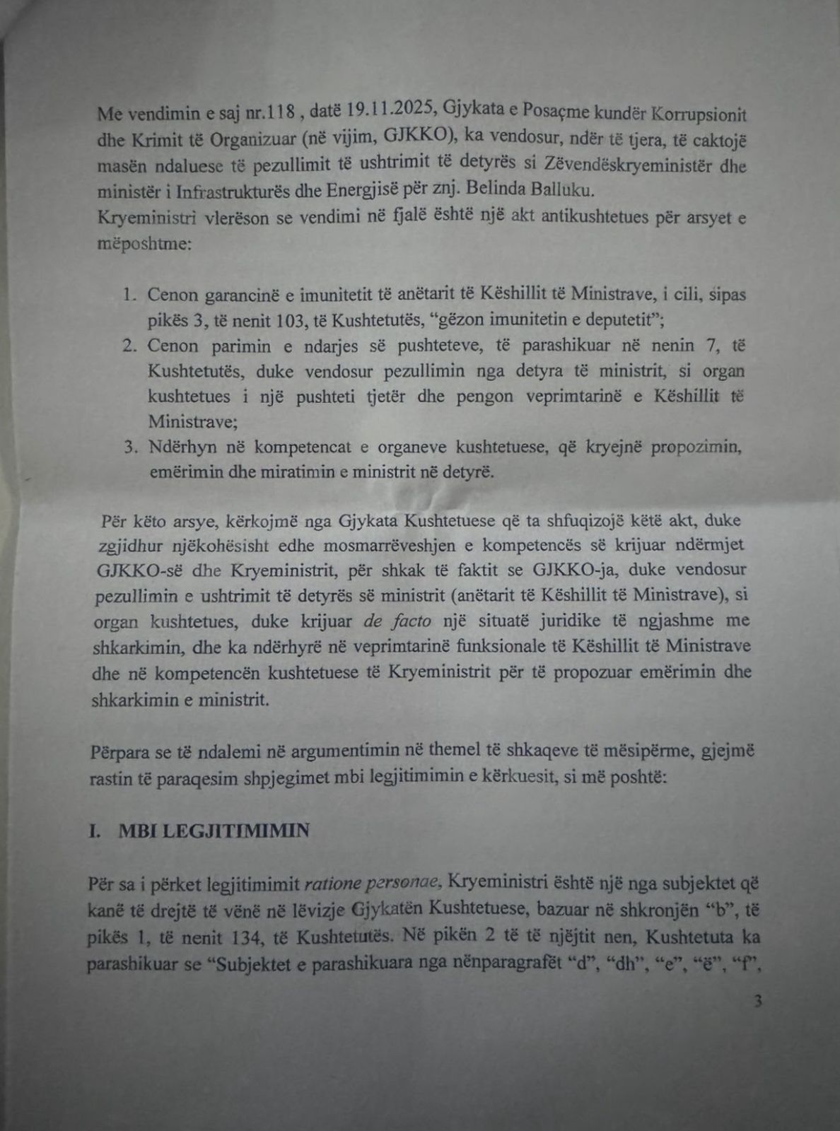Qeveria kërkon pezullimin e vendimit të GJKKO-së vetëm për pjesën e pezullimit nga detyra të Belinda Balluku, duke pretenduar se ky vendim prek interesa të larta shtetërore, shoqërorë, por edhe të vetë individëve.
