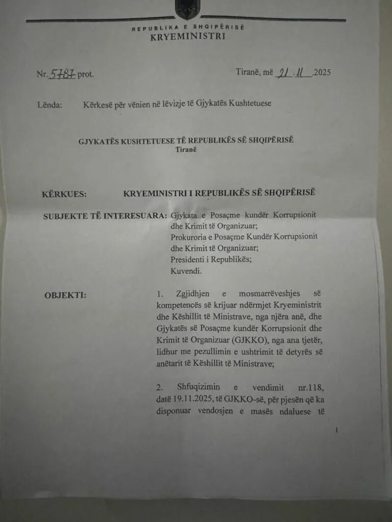 Gazeta Si – Përmes një shkrese zyrtare, Këshilli i Ministrave i kërkon Gjykatës Kushtetuese shfuqizimin e vendimit të GJKKO-së për pezullimin nga detyra të zv/kryeministres dhe njëherësh ministres së Infrastrukturës dhe Energjisë, Belinda Balluku, e cila është marrë e pandehur nga SPAK.