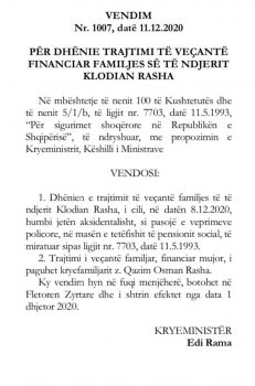 Siç thuhet në vendimin e Këshillit të Ministrave, për Qazim Rashën, babain e të ndjerit qeveria ka lidhur një pension rreth 8-fishi i pensionit social për çdo muaj.