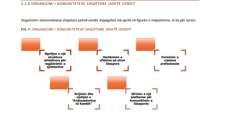 “Ky komponent do të realizohet ngushtësisht me Kosovën, ndaj një hap i rëndësishëm në këtë aspekt do të jetë hartimi i një plani të përbashkët institucionale me zyrën e IOM-it në Tiranë. Strategjia Kombëtare do të nxisë pjesëmarrjen e diasporës në procesin e zhvillimit ekonomik të vendit. Për më tepër, do të inkurajohet përthithja e investimeve të diasporës, krijimi i ndërmarrjeve të vogla e të mesme në disa fusha, përfshirë bujqësinë, industrinë e ushqimit dhe zhvillimin e zonave rurale. Me anën e Strategjisë Kombëtare do të punohet për të krijuar një klimë të favorshme për investimet nga diaspora nëpërmjet aktiviteteve për stimuj fiskalë, shpërndarje informacioni, duke ulur korrupsionin, risqet, apo duke përmirësuar elementë të tjerë që e bëjnë të mundur klimën e investimeve.