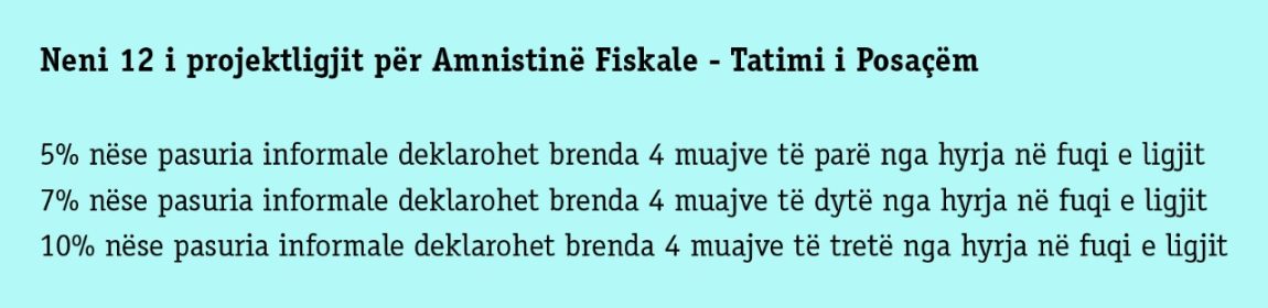 Tatimi i posaçëm është konceptuar si nxitje për vetëdeklarim për të gjitha subjektet e ligjit, ku në 4 muajt e parë ata duhet të paguajnë 5 për qind të shumës totale të deklaruar gjatë katër muajve të parë pas hyrjes në fuqi të ligjit, 7 për qind nëse deklarimet i bëjnë në katër muajt e dytë dhe 10 për qind nëse deklarimin e bëjnë në katër muajt e tretë të hyrjes në fuqi të ligjit.